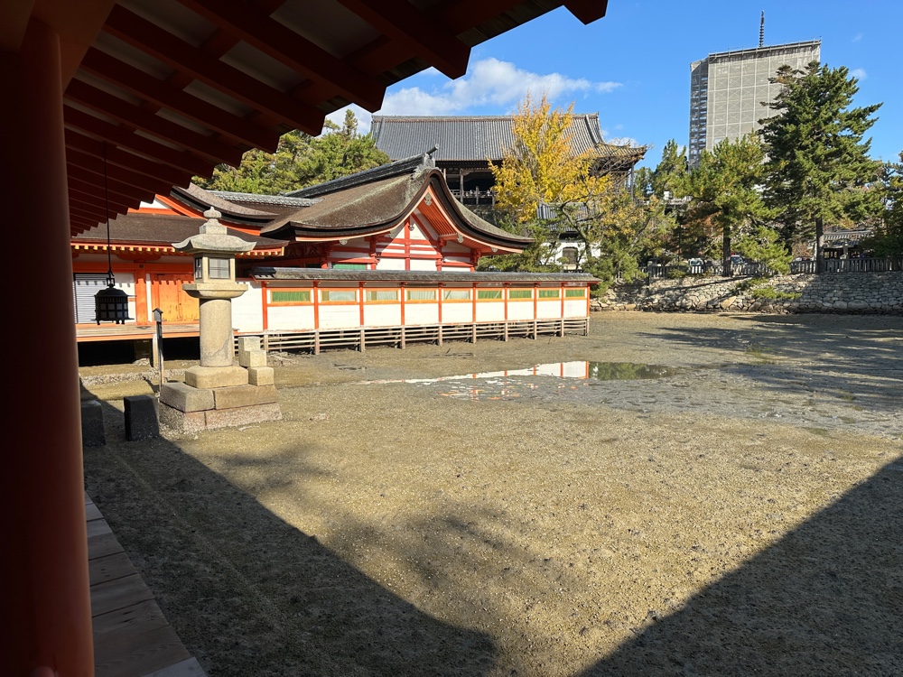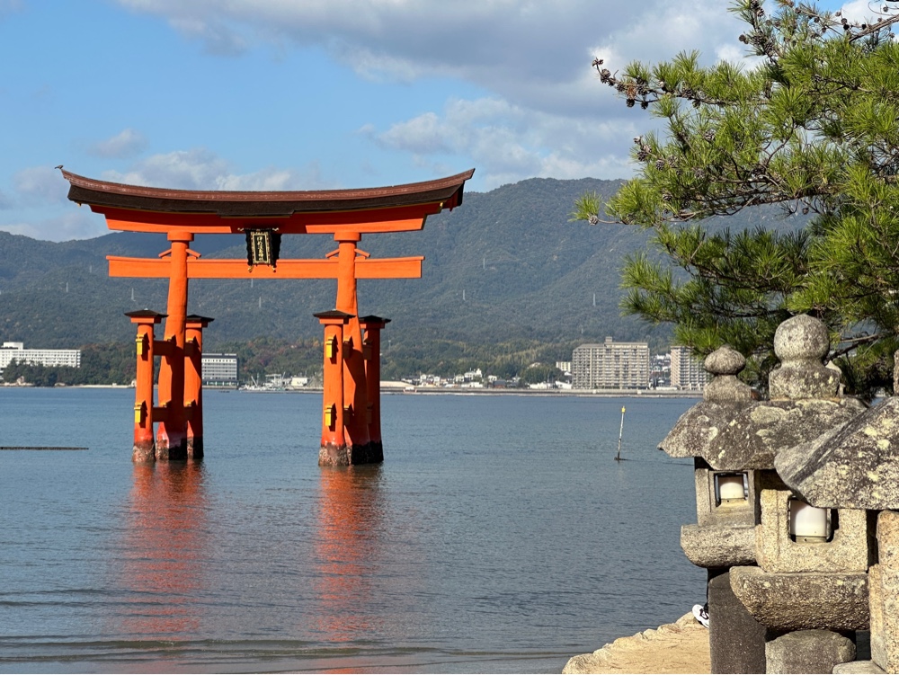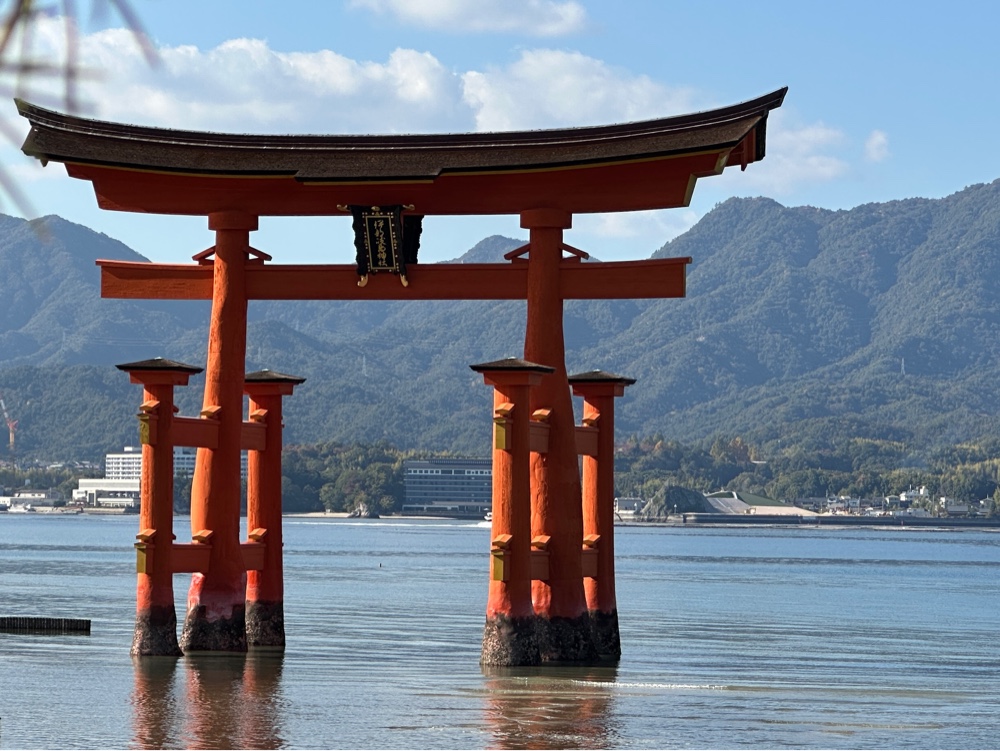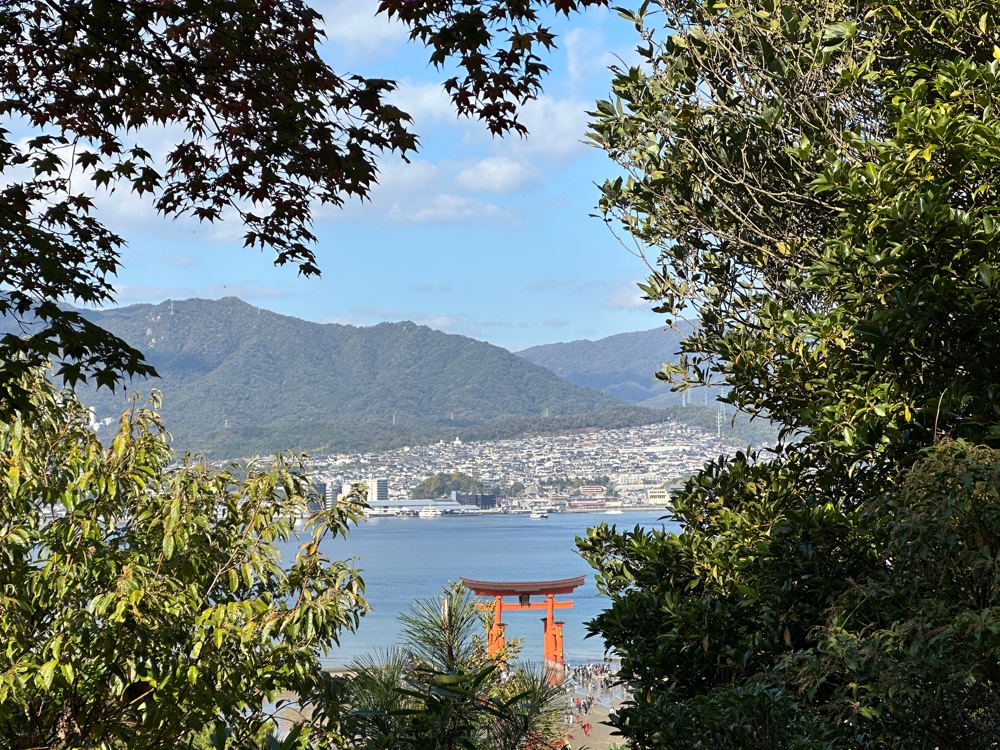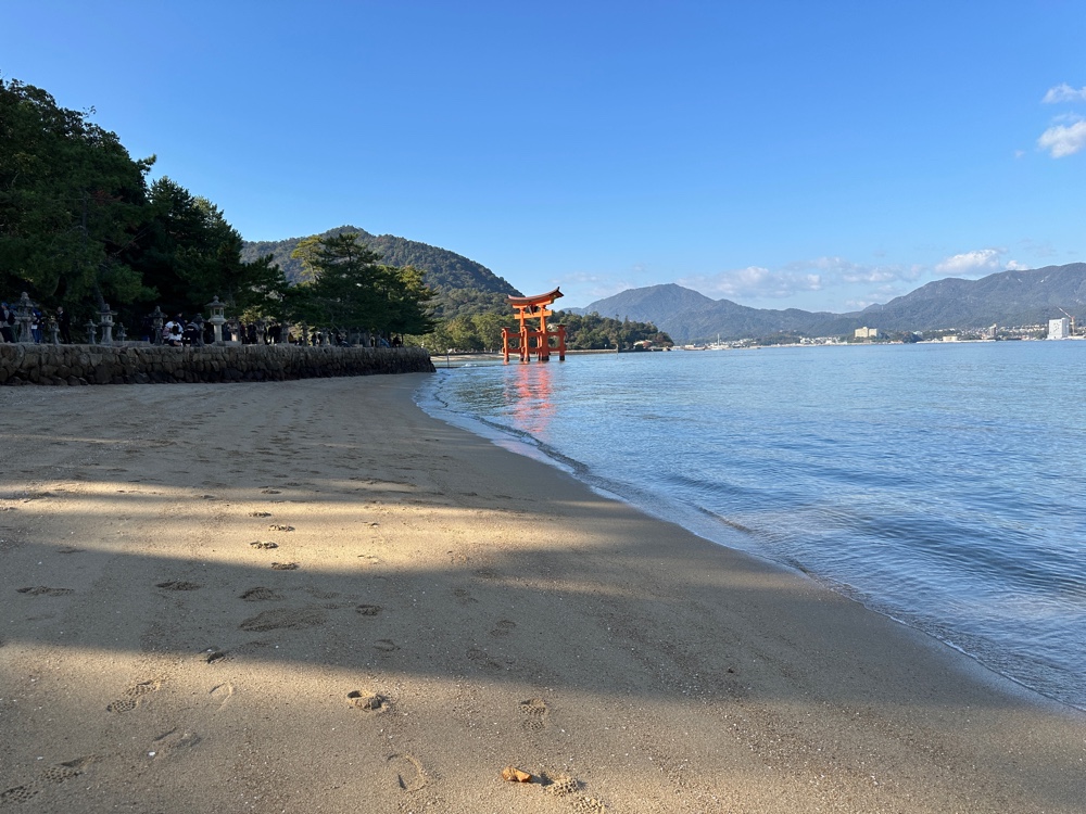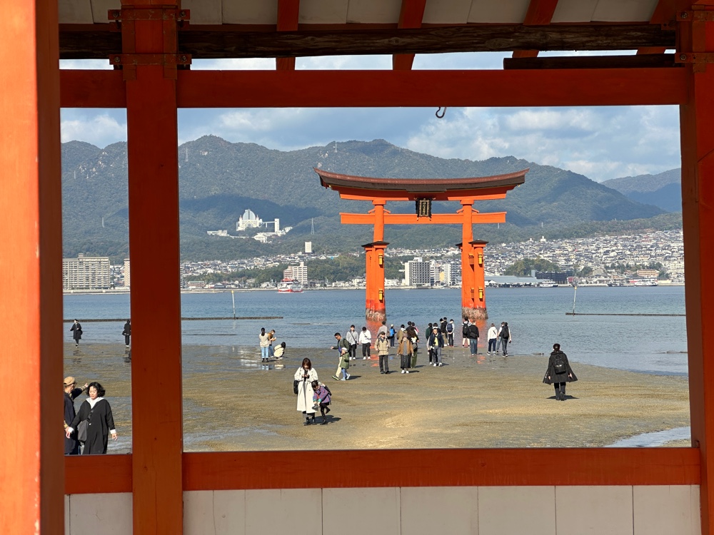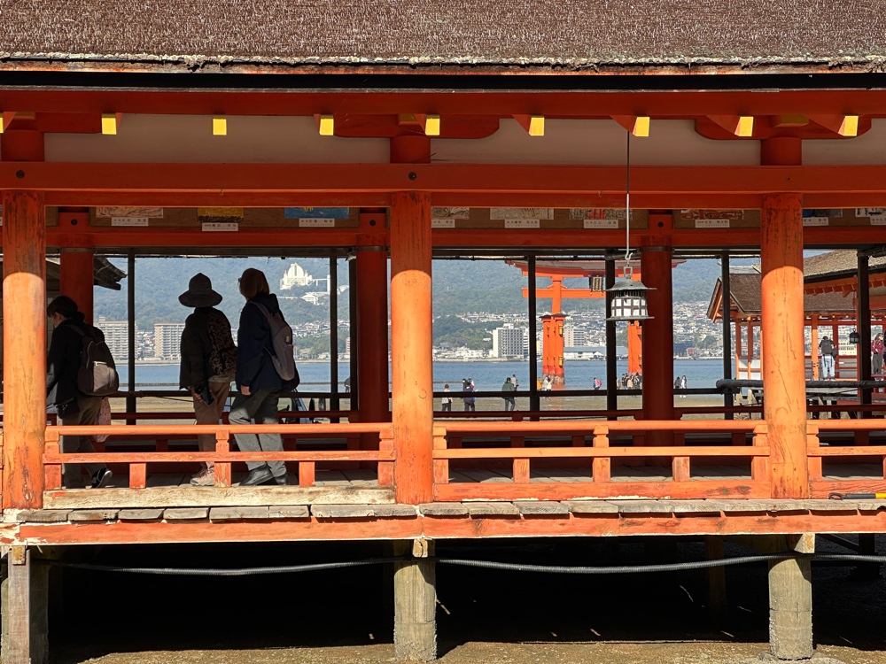 and the Itsukushima shrine. Tori gates welcome you to shrines, so it actually is part of the shrine. At the right tide, the shrine looks like it floats. However, today we saw it surrounded by mud. And it was quite crowded. At least we were on the first ferry, and visited the shrine immediately.